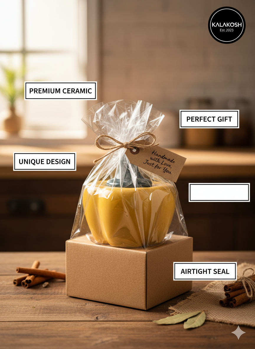ceramic jar container pickle achaar home decor storage kitchen office use table accent vase decorative handcrafted artisan stoneware yellow pepper vegetable design chutney spices unique gifting festival