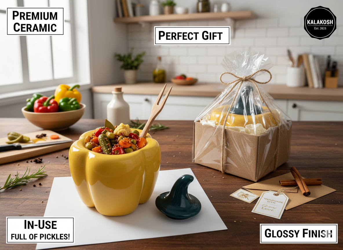 Transform your kitchen and dining experience with this premium ceramic pickle jar container, designed to be a centerpiece of your home decor. Its unique, vibrant yellow bell pepper shape instantly adds a playful yet sophisticated rustic charm to any setting. More than just a simple home use storage unit, the rich, glossy finish and contrasting dark green stem lid elevate it to a decorative home decor vase or a stylish accent for your office use.