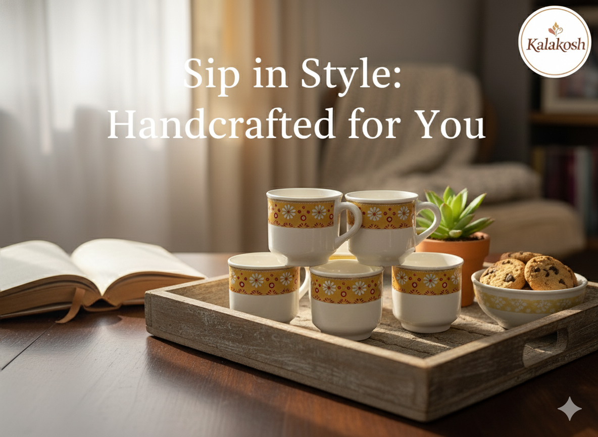 Each cup is a testament to skilled craftsmanship, featuring a charming white body beautifully contrasted with a vibrant yellow-gold and floral pattern. The slightly textured feel and clay tea cup set construction offer a comfortable, artisanal grip, making every sip of your favourite chai, coffee, or herbal infusion a moment of pure comfort.