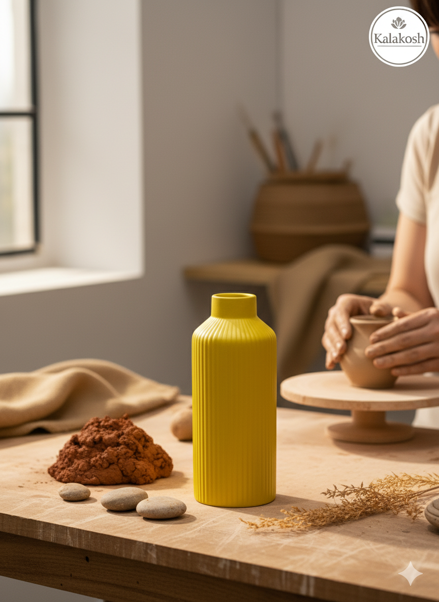 Meticulously handcrafted by skilled artisans, the vase features a tactile, fluted (ribbed) texture and a rich, matte yellow finish. It’s made from eco-friendly clay/ceramic, making it a sustainable choice for your office decor, living room, or balcony. Use it to display vibrant blooms, tall dried grasses, or a striking single stem. Its versatile cylindrical shape and bold color make it an instant table centerpiece or a focal point on a shelf or desk.
