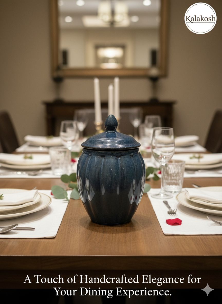 Crafted from durable, high-quality clay and finished with a rich, deep blue, glossy glaze, this jar features a subtly fluted, pumpkin-like design that catches the light beautifully. The premium speckled finish and elegant knob-style lid make it a standout item.