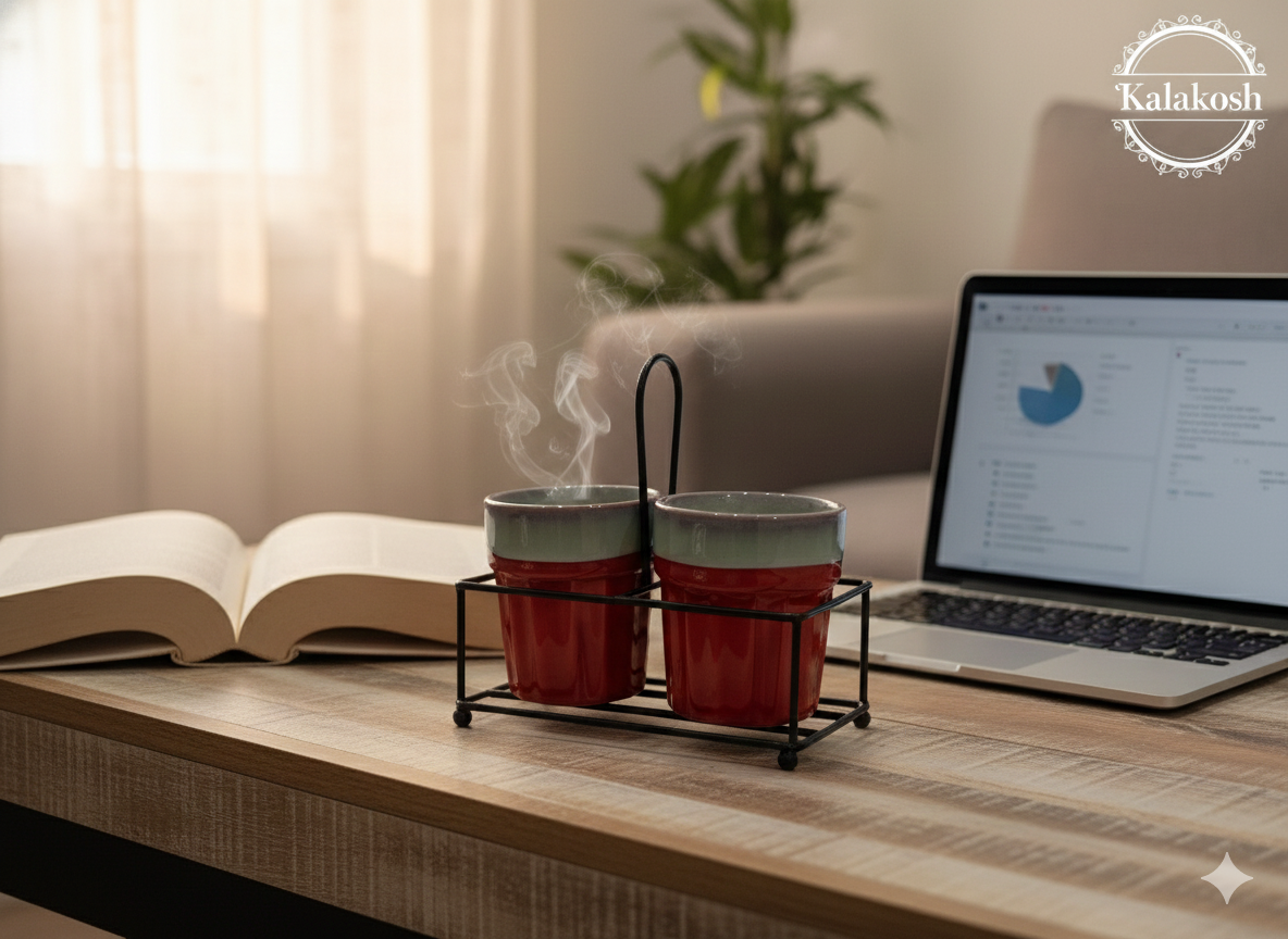 Handcrafted from high-quality ceramic, these cups offer excellent heat retention, ensuring your tea, coffee, or hot chocolate stays warm longer. The set comes with a custom-fitted black iron carrier stand, making it incredibly easy to serve guests or move from the kitchen to your balcony or office desk. Whether you are looking to spruce up your home use essentials or need a stylish addition for office use, this set fits seamlessly into any environment.