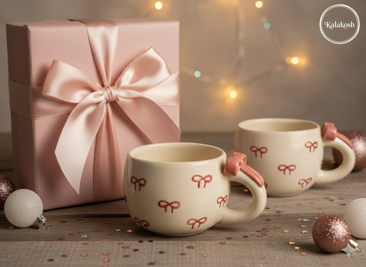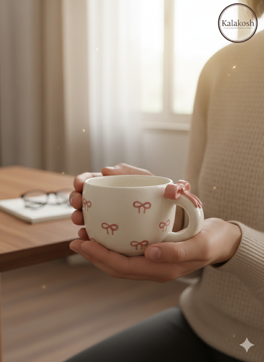 Premium Handcrafted Ceramic Tea and Coffee Cup Set of 2 | 3D Bow Handle Coquette Aesthetic Mug for Home Decor, Office Use & Gifting | Elegant White & Pink Home Decor Vase Style Cup (300ml)