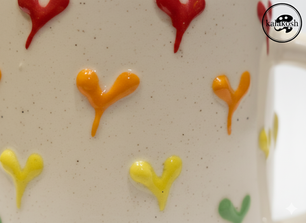 Start your day with positivity using our handcrafted Rainbow Heart Ceramic Mug. Designed for those who love to add a quirky and cheerful touch to their surroundings, this mug features a stunning array of embossed, 3D hearts in vivid rainbow colors set against a creamy, speckled beige background.